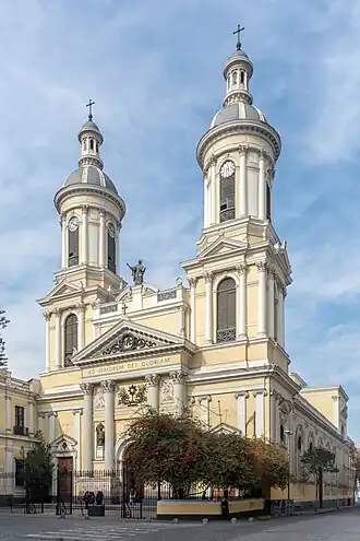 Sus dos torres tienen una altura de 47 metros, y pesan 20 toneladas cada una, son de base cuadrada y están coronadas por una cúpula.[1] La del lado izquierdo posee un reloj de cuatro esferas, fabricado en Bilbao e instalado en 1901 por Evaristo Molina; la del lado derecho, tres campanas, dos de las cuales fueron creadas a partir de una campana que tañía en el antiguo templo de los jesuitas, destruido en un incendio en 1863. Con la cooperación del presidente Federico Errázuriz Zañartu y del ministro Aníbal Pinto, la campana fue devuelta a la orden de los jesuitas, quienes la fundieron y construyeron las campanas de dicha torre.[4]