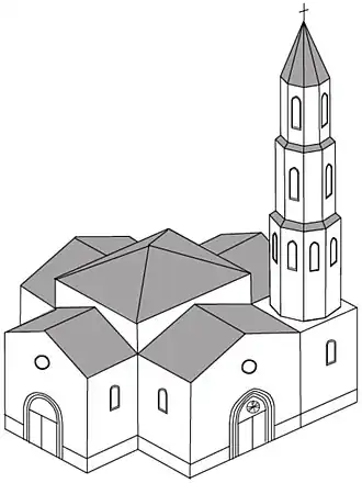 ![]() Recreación hipotética de la iglesia para principios del siglo XIX, basado en un dibujo de De Retz de 1800. | ||