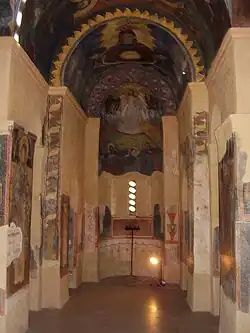 El interior de la iglesia ha conservado una serie de frescos medievales, especialmente en la parte inferior de los muros y pilares. Las pinturas del altar se realizaron en los siglos XI y XII, mientras que la decoración de los pilares data del siglo XII. Todas las inscripciones que acompañan a los murales están en griego medieval. El altar presenta las imágenes de cuatro diáconos que llevan un pebetero y custodias, así como dos obispos que posiblemente podrían identificarse como Basilio el Grande y Juan Crisóstomo. También se representan varios santos dentro de la iglesia, incluidos San Elías, Santos Cosme y Damián, San Hermolao, San Pantaleón y cuatro santas no identificadas.[5] También hay obras de arte posteriores en la iglesia. Cuenta con iconos o murales del pintor Iván Dospevski de 1881, así como obras de Mihail Belstoynev.[6]