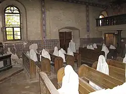 El interior del templo, en estado ruinoso y carente de ornamentos debido al expolio sufrido, alberga actualmente más de treinta[13] esculturas a tamaño natural cubiertas con telas blancas[1] y repartidas por las bancadas del santuario y zonas adyacentes, cerca de la tribuna, con algunas de pie y otras (la mayor parte) sentadas en los bancos. Según Hadrava: