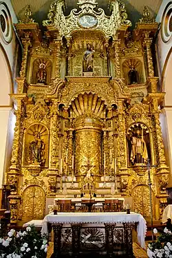 Lo que más se destaca del templo es su altar mayor, que de acuerdo a su estilo barroco con detalles churriguerescos data del siglo xviii. La construcción del altar consiste básicamente en un labrado de caoba recubierto con oro. Las imágenes que se pueden ver en el Altar de Oro son las de San José, el padre terrenal de Jesucristo; Santo Tomás de Villa Nueva, ubicado arriba a la derecha; Santa Clara de la Cruz de Montefalco, encontrada arriba a la izquierda; San Agustín se encuentra debajo de Santa Clara; y Nuestra Señora de la Consolación, quien sostiene al Niño Jesús sobre sus rodillas. Arriba del retablo se ve, dentro de un círculo al Padre Eterno, teniendo su cabeza enmarcada en un triángulo, que es el símbolo de la Santísima Trinidad, con su mano derecha bendice al Mundo y en la mano izquierda con una balanza, símbolo de la Justicia sostiene al Universo.[1]