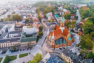 La iglesia está inspirada en la de la Basílica de Santa María (Cracovia). Situada en el mismo lugar en el que existía una anterior que fue derruida, cuenta con una esbelta torre poligonal de 80 metros de altura que se alza sobre el crucero, a ambos de lados de la entrada, sendas torres más bajas terminadas en pináculo que enmarcan una gran vidriera central. La fachada principal consta de tres puertas rodeadas de numerosas esculturas de santos. El interior, también en estilo neogótico, tiene varias capillas laterales y un altar central dedicado a San José que fue realizado entre 1908 y 1909.[1] En 1999 el entonces párroco Franciszka Kołacza, emprendió la renovación y restauración del templo que afectó a los altares, púlpito y órgano. La iglesia recuperó su color interior original de tono gris que había sido sustituido por un tono azul-verdoso en un periodo anterior.