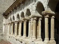 La iglesia de salón columnaria cuenta con tres naves y tres ábsides, pilares redondos y bóvedas nervadas. A los pies hay una torre, del siglo XIV, y un claustro románico, tosco, hermoseado por una cubierta mudéjar, de artesón y tirantes, toda pintada con adornos y escudos de castillos, leones y bandas. Según Vicente Lampérez se trataría de una construcción de principios del siglo XIII, a la que pertenecen la torre y el claustro, que fue reconstruida en el XVI, conservando la torre y techando de nuevo el claustro.[1]