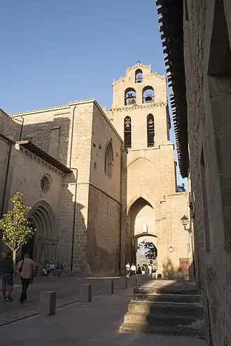 La iglesia está adosada a la muralla y a la torre que protege la entrada a la ciudad desde el sureste. Se construyó como templo-fortaleza. Se distinguen varias etapas en su construcción, el templo que comenzó siendo románico se transformó a gótico: los primeros elementos edificados se corresponden con el siglo XII o principios del XIII y tienen una marcada influencia francesa. La mayor parte de la iglesia fue construida entre los siglos XIII y XIV en un estilo gótico que constituye el núcleo fundamental del edificio: bóvedas de crucería y terceletes, coro, ábsides, el rosetón del muro de la capilla, etc. En el siglo XVI parte de esta disposición inicial desapareció: el templo dejó de tener función defensiva (por ejemplo, se reconvirtió la torre almenada del antiguo castillo militar en un campanario) y se llevó a cabo una importante ampliación.[1][3][4][5]