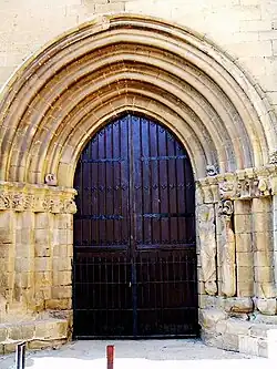 La portada sur, conocida como la de los abuelos, es la única original que se conserva. Fue construida en el segundo tercio del siglo XIII. Consta de cinco arquivoltas formadas por baquetones. Se conservan a la izquierda dos columnas con fustes retallados completamente; en uno hojas de palmera, en otro flores formando cuadros. Los capiteles correspondientes a estas columnas apuntan la transición al gótico, tienen esculpidos animales entrelazados con ramas de árbol. A la derecha los apoyos son dos estatuas que representan la Anunciación. Los capiteles de la derecha son totalmente románicos. Sobre la portada destaca el óculo circular ornamentado en interior y exterior. Está recubierto con decoración de motivos vegetales y presenta cierto abocinamiento. En la parte interior podemos ver figuras muy expresivas entre las que destacan animales fantásticos y otras de difícil identificación por su avanzado estado de deterioro.[9][10][8]