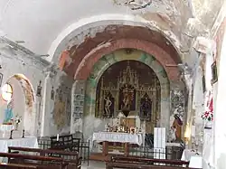 La bóveda de la nave es de arco de medio punto, reforzado con tres arcos torales. Todo esto hace la impresión de ser obra del siglo XVII. Ahora bien, la extraña sacristía que hay en los pies de la nave, se puede descubrir la obra románica subsistente de las muchas reformas que ha sufrido: es la base de un campanario cuadrado, con obra de la segunda mitad del siglo XI. Todavía se pueden ver las lesenas que enmarcaban cada lado, así como los ventanales, tapiados. El emplazamiento de la nave debía ser al lado, donde está el cementerio del pueblo.
