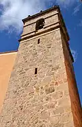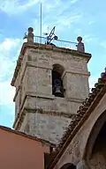 En la parte sur, a los pies de la epístola, se eleva la torre, que está construida con sillares. Presenta dos cuerpos y remate liso. El primer cuerpo forma parte de la fachada del templo, mientras que el segundo se eleva sobre éste y en él se abren ventanas.[1] La torre alberga las campanas en un vano con forma de arco de medio punto en cada cara, para acabar la zona de campanario se adorna el antepecho con bolas.[3]