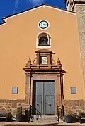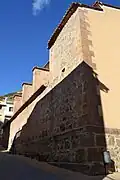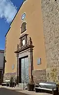 La puerta de acceso presenta dintel de tipo retablo, de dos cuerpos, cubriéndose el segundo con un frontón curvo, y rematado en el cuerpo superior por pináculos.[3] En la hornacina existente en el retablo había en el siglo XVII un azulejo de Alcora, de la imagen de San Juan Bautista, que actualmente se encuentra en el interior de la iglesia, mientras que en su lugar se colocó en el año 1995 una reproducción del mismo.[1]