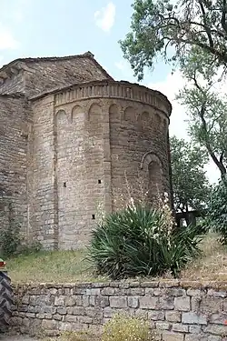 El ábside semicircular, que data de la época románica, está dividido por cuatro lesenas y once arcadas ciegas (cinco en el medio y tres a cada lado). Sobre los arcos hay una cornisa con un friso de baquetones, característica de las iglesias de Serrablo, paisaje histórico entre Sabiñánigo y Biescas. En el centro del muro este del ábside hay una ventana arqueada.