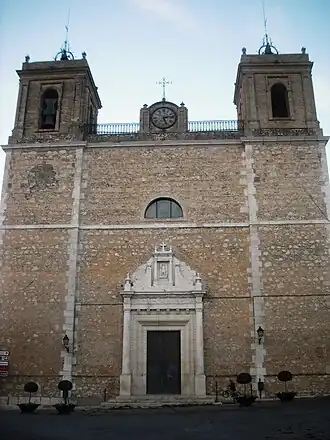 La iglesia tiene dos torres que hacen de campanarios. La de la izquierda tiene las campanas, la de la izquierda dispone de "la carraca", que sonaba durante la época de Cuaresma para avisar de las horas de culto cuando estaba prohibido que sonaron las campanas.