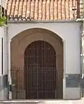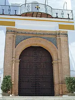 La portada principal, a la que se accede a través de una escalinata, es de estilo mudéjar-renacentista y está realizada mediante arco de medio punto de ladrillo, con azulejería en las enjutas, enmarcado por pilastras con finas columnas abalaustradas de orden jónico adosadas, también de ladrillo. Se corona con un balcón de fino balaustre de hierro forjado situado entre grandes contrafuertes rematados por pináculos, que le confiere un cierto aire civil y sobre el que se sitúa un gran óculo moldurado de ladrillo.
