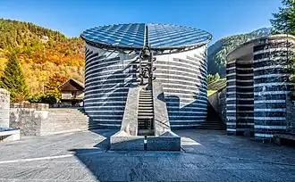 La nueva iglesia fue diseñada por el arquitecto suizo Mario Botta,[4] que utilizó el mármol y el granito de los valles de la zona. La iglesia se basa en una estructura con una planta elíptica, un cilindro de piedra, con un "corte" de una superficie de vidrio inclinada que sirve como cubierta.