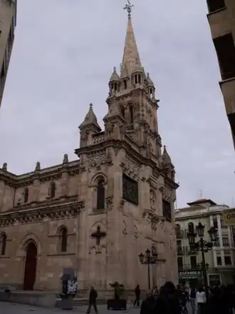 En la fachada destaca su torre acabada en un gran pináculo, su fachada contiene en la parte más alta un rosetón, a la derecha del rosetón una representación escultórica del milagro del pozo amarillo y a la izquierda otra, esta de la pacificación de los bandos, los dos milagros efectuados por San Juan de Sahagún. En la parte baja siete arcos ciegos y la portada formada por un arco apuntado.