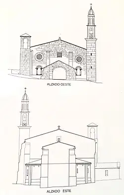 La torre del ángulo norte de la fachada está formada por dos paralelípedos rectangulares superpuestos. En el superior se abren cuatro arcos de medio punto donde estarían ubicadas las campanas y se cubre con cubierta a cuatro aguas. La torre del ángulo sur de la fachada, actualmente de las campanas, fue modificada en época barroca, presentando actualmente tres cuerpos, un inferior con apenas dos troneras, un intermedio de planta también cuadrada con las aberturas en arco de medio punto para las campanas y un superior formado por una linterna de planta octogonal coronada por una cupulina apuntada, también de base octogonal.