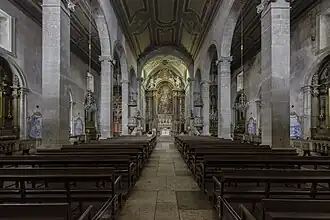 La nave de la iglesia está dividida en tres naves por arcos construidos durante la reconstrucción manierista que siguió al terremoto de 1531. Tras el terremoto de 1755, el interior fue redecorado en estilo barroco, con columnas doradas decoradas con esculturas de talha dourada (esculturas de madera cubiertas en pan de oro) en el coro y un impresionante retablo. La pintura del retablo mayor es obra de Pedro Alexandrino.