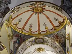 Respecto a su interior, destacan en él las pinturas de carácter popular con vivos colores, que se conservan prácticamente en su totalidad. Estas pinturas, pertenecientes al barroco tardío de finales del XVIII, están por los frisos, zócalos, pilastras, muros, pechinas de la cúpula (en las que se puede ver a los cuatro evangelistas) y bóvedas (en cuatro de ellas se describe a los cuatro doctores o padres de la iglesia y en otras cuatro las virtudes cardinales).[2][4]