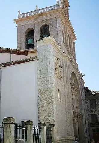 La fachada principal se concibe con el gigantismo característico del barroco, con grandes columnas y pilastras de orden corintio, remates en bolas y frontón partido por una ventana, sobre el que se abre una hornacina con el santo titular. Dos grandes escudos flanquean la portada. Es singular la solución arquitectónica de situar la torre, un macizo prisma más ancho que largo, de manera que prolongue la fachada en uno de sus lados que a su vez es rematado con una espadaña. No puede hablarse propiamente de estilo barroco jesuítico, que es más sobrio y puro de líneas, además de ser su desarrollo en España unas décadas anterior a la construcción del templo burgalés.