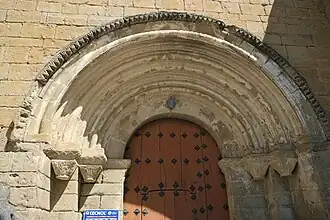 La portada está orientada al sur y es de finales del siglo XII de estilo románico,[1] está decorada con cuatro arquivoltas[1][2] construidas bajo molduras de punta de diamante que se apoyan en capiteles, los cuales se sostienen a su vez sobre columnas. Es posible que durante siglos hayan faltado estas columnas, hasta su restauración en 2014.[4]