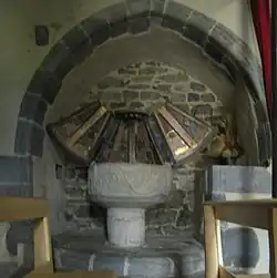 En el interior se conservan dos pilas románicas; una de agua bendita semicircular empotrada en el muro y decorada con ornamentación de vegetales de poco relieve y un cordón trenzado en la parte inferior, y una pila bautismal, emparentada estilísticamente con las de Viella, Begós, Escuñau o Betlán, entre otras del valle. La iconografía de la pila se centra en motivos de figuración humana completados con un ritmo ondulante de origen vegetal –tallos y hojas–, con la inclusión de estrellas de cinco y seis puntas. La presencia de motivos como la flor de lis, de influencia francesa, o la permanencia de figuras arcaicas más allá del siglo XII, sitúa esta pieza cronológicamente entre los siglos XII y XIII.[1][3]