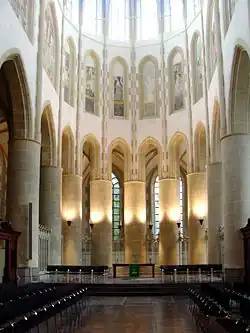 El interior está dividido en dos partes bien diferenciadas: las naves del tipo hallenkirche, divididas en tres por pilastras que se prolongan directamente en las bóvedas; y el grandioso coro con deambulatorio con un alzado en tres niveles de arcadas, triforio y claristorio.