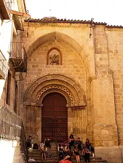 En la actualidad el templo consta de dos accesos: la puerta del Obispo, de construcción románica, y la puerta del Mediodía, renacentista. Originalmente eran tres, pero el acceso por los pies del templo ha sido reconvertido en capilla camarín, dedicada a Nuestra Señora de las Angustias, a cuyo interior únicamente se accede desde el interior del templo.