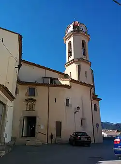 En cuanto a la fachada principal, adaptación de modelos post-tridentinos, está formada por tres elementos básicos, el portal, las ventanas y el óculo. Primero hay un zócalo pintado y enlucido. La puerta de madera con escalones de acceso está enmarcada de piedra y tiene molduras en los ángulos interiores y una gran dintel monolítico con una inscripción de finales del siglo XVI, seguramente reaprovechada y originaria de otro sector de la iglesia, ya que la fachada no es tan antigua. Las ventanas son de piedra y una de ellas tiene un dintel con la fecha de 1602. El óculo circular, centralizado en el primer piso sobre el portal de acceso y datado de 1885, también está enmarcado de grandes bloques de piedra moldurada y contiene vitrales coloreados con decoración geométrica, floral y con el escudo papal de Roma. Encima hay otro óculo pequeño sin marco de piedra. Finalmente, la línea del tejado y dos molduras cóncavas debajo de este, a ambos lados de la nave central, enmarcan la fachada principal.[1]
