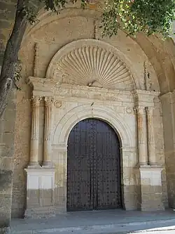 Al exterior consta de dos portadas. Una de ellas, la norte, es de estilo plateresco y está protegida por dos grandes contrafuertes. Presenta un arco de medio punto flanqueado por columnas pareadas de orden corintio sobre plinto, rematando un entablamento corrido coronado por una gran venera con pináculos moldurados a los lados. En la portada aparecen los símbolos de la Orden de Santiago, que colaboró en la construcción del templo y en la repoblación de la zona. La portada sur es más sobria, en estilo dórico con frontón y típicas bolas herrerianas. La torre situada a los pies es de planta cuadrada y está dividida en dos tramos separados por cornisa.[1]