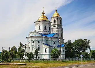 El templo es inusual porque es una síntesis de arquitectura y escultura, único en su tipo en la Ucrania de la margen izquierda. El estilo es originario del Monte Athos en el siglo XIV y llegó a Ucrania entre los siglos XV y XVI. El estilo es barroco ucraniano, la estructura espacial es la de un templo neoclásico ruso, la decoración exterior está llena de altos relieves escultóricos, que se utilizan en la decoración de las iglesias católicas, y se distingue por la solemnidad y la elegancia tanto en el exterior como en el interior. La iglesia está decorada con una magnífica decoración en forma de pilastras corintias, plataformas con figuras y numerosos relieves de estuco.