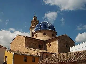 La torre campanario es de planta hexagonal y se ubica en el lado de la Epístola. Consta de tres cuerpos con remate en cupulín.[1] Se construyó después de 1789, siendo Matías Llorenç y Francisco Marzo sus autores. El primer cuerpo es de mampuesto y sillares en las esquinas; el segundo, donde se ubican las campanas, está hecho todo él con sillares, con pilastras en los ángulos; un tercer cuerpo está realizado de ladrillo, con partes que presentan enlucido.[3]