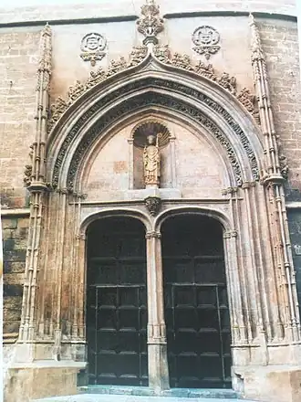 - En el siglo XV los herederos de Arnau Desmur y la familia Pax, demostraron su generosidad e implicación con la parroquia al volver a dar importantes donativos para reconstruir el templo tras su derrumbe. En esos momentos se construyeron la fachada principal, que describe la traza típica del gótico catalán: cuadrada y flanqueada por dos torreones octogonales; los dos portales, mayor y lateral (atribuidos a Francesc Sagrera);[2][3][4] y las pinturas góticas de San Nicolás (obra de Miquel d´Alcanyís II) y San Magín.[5]