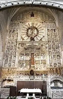 Este retablo mayor fue financiado por el mercader burgalés don Gonzalo Lopez de Polanco, cuyo sepulcro gótico y el de su esposa Leonor de Miranda reside al principio de la fachada oeste del retablo. El sepulcro de su hermano don Alfonso de Polanco y su esposa Constanza de Maluenda se encuentra al principio de la fachada este.