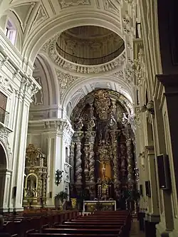 El interior es de un claro estilo jesuita, de planta de cruz latina, de única nave pero con grandes capillas laterales intercomunicadas a las que se tiene acceso por arcos de medio punto. Sobre el amplio crucero una gran cúpula hemisférica con balconada y rematada en una linterna. La nave va cubierta con una bóveda de medio cañón.
