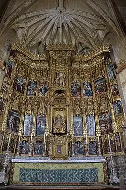 De estructura gótica y realizado en madera dorado, cuenta con dos cuerpos de altura y siete calles más dos alas laterales, en el centro tiene imágenes atribuidas a Antón Vázquez, quedando el resto ocupado por 24 pinturas sobre tablas, obra de los pintores Hernando de Esturmio, Pedro Fernández de Guadalupe y Antón Sánchez de Guadalupe. Se encuentra coronado con una crestería en su parte superior.