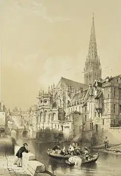 Hasta mediados del siglo XIX, la cabecera oriental de la iglesia se enfrentaba al canal que fue cubierto y sustituido por un calle. Varios artistas y grabadores registraron esta relación de la iglesia con el canal; por ejemplo, el pintor escocés David Roberts hizo varias vistas muy similares, una de los cuales (fechada ca. 1830) se encuentra en Musée des Beaux-Arts en el castillo de Caen.[7]