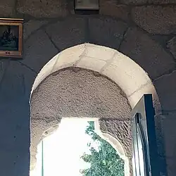 Respecto al interior (con planta rectangular de una sola nave, cubierta de madera a dos aguas y tribuna también de madera), en él destaca el arco triunfal ojival con las roscas en forma de arista; la situada en el exterior fue retallada para poder emplazar los retablos laterales, mientras que la interior está apoyada en cimacios con perfil rectilíneo y nacela, ambos divididos por una franja incisa y bajo los cuales se hallan pilares entregos de fuste corto. El del lado del evangelio luce un capitel cubierto con ornamentos de corte vegetal: en el frente una hoja de gran estrechez y reducido tamaño pegada a la cesta (con la zona superior doblada hacia sí misma para configurar una esfera de volumen escasamente desarrollado) funge como eje para las dos hojas de mayor tamaño, en las que los nervios, excavados y dibujando unas estrías terminadas en pico, producen en los extremos superiores entrantes y salientes los cuales crean claroscuros, además de que los ápices, que se erigen en dirección a los ángulos del capitel, se tornan hacia abajo al tiempo que se doblan formando esferas a modo de volutas. Por su parte, en la superficie interfoliar presente entre las grandes hojas laterales y la central, más pequeña, figura una esfera de reducidas dimensiones, repitiendo las caras de los lados idéntico patrón, si bien aparecen más elementos, ya que la hoja del centro posee un nervio axial perlado más otros dos nervios excavados, uno en cada lado. El pilar, con un fuste compuesto por un total de cuatro tambores, se halla sostenido por una basa compuesta por dos toros y entremedias una escocia (basa ática) en cuya zona superior se muestra un filete en sustitución del toro a la vez que una tenia sirve de reemplazo a la escocia, estando el toro de la parte inferior poco desarrollado a nivel horizontal, donde sobresalen unas garras caracterizadas por unas cintas muy finas. Bajo la basa se ubica por otro lado un plinto de base rectangular el cual se erige sobre el zócalo que inicialmente debió de recorrer la nave en su totalidad y que hoy queda reducido a este segmento del arco, mostrando un borde abocelado y una baqueta debajo.[1]: 321