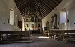 El envigado es de tablas de chañar y algarrobo, amarradas con cintas de cuero crudo de llamo, y la techumbre de tablillas de cactus cubiertas con barro y paja.[10] Posee una planta en cruz latina que tiene 41 metros de largo por 7,5 metros de ancho. Su piso es de pino oregón.[7]