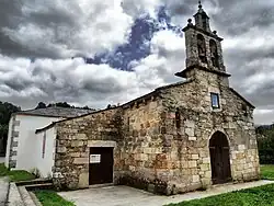 Está construida en cantería y mampostería de granito, con parte de sus muros encalados. La cubierta es de pizarra a dos aguas. Consta de nave principal y nave lateral, separadas por arcos de medio punto, y ábside semicircular. La fachada contiene la puerta principal, con arco de medio punto sin decoración, y la espadaña, de doble cuerpo y con dos vanos. Hay una puerta lateral románica, que está tapiada. En la cornisa destacan los canecillos de diversas formas, especialmente en el ábside. Los muros exteriores contienen varias inscripciones.