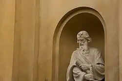 Debajo de la estatua, figura la frase "Haec est domus domini", que en español significa: "Ésta es la casa del señor"