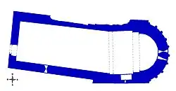 Una sola nave de 20, 50 x 2,40 m. construida con sillares dispuestos en hileras y cubierta con bóveda de cañón con arco pre absidal y arco toral a la altura donde la nave modifica su dirección. Ambos arcos, de medio punto.