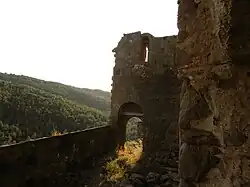 ![]() Ábside de la iglesia y uno de los muros del castillo | ||