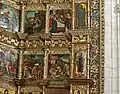 Lo más destacable es su retablo mayor, de estilo plateresco, dispuesto en tres planos por adaptarse a la forma del ábside. Cada uno de ellos está formado verticalmente por tres calles, con sus entrecalles y guardapolvos en los extremos, y horizontalmente por zócalo, predela, tres cuerpos y ático rematado en medio punto. Fundamentalmente pictórico, lo componían 51 tablas atribuidas antes al Maestro de Olivares, posteriormente identificado con Juan Soreda, de las que una de ellas, el profeta Balaan de la predela, desapareció por robo. La escultura se reduce a la calle central y las labores propias del ensamblaje, obra de Pedro de Guadalupe. Las esculturas propiamente dichas, San Pelayo, Asunción y Calvario no están documentadas, habiéndose atribuido, por cercanía de estilo, a autores como Felipe Bigarny o Alonso Berruguete.