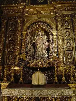 Este altar en el transepto izquierdo / oeste fue encargado en 1622 por Gonçalo Pires de Carvalho, supervisor de Obras Reales (es decir, Públicas), y su esposa, D.ª Camila de Noronha, como su tumba y como tumba de su casa. según una inscripción en el escalón de piedra.[63] Fue construido en estilo manierista, similar a innumerables retablos que se conservan en iglesias romanas, como San Pedro y la Iglesia del Gesù. Es el retablo más antiguo que se conserva en una iglesia jesuita en Portugal, notable por su uso precoz de mármoles con incrustaciones de color.[64] En el centro de la pieza alar hay una escultura muy dramática con características barrocas distintivas de Nuestra Señora de la Merced, o Piedad, en coloridas maderas tapizadas del siglo XVIII.[65]