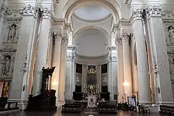 El interior, de una sola nave, conserva diversas obras de arte en las ocho capillas laterales. Entre las más importantes, están: