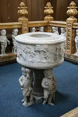 Es una pila cilíndrica de mármol que está sostenida por un pedestal y cuatro putti, los cuales además portan ciertos atributos, como la manzana y la serpiente o las tablas de la ley. En el exterior de la pila hay un relieve que muestra escenas como el bautismo de Jesús o el viaje a Emaús.