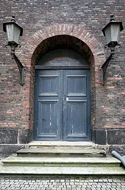 La iglesia tiene entradas en los extremos de los brazos, salvo en el brazo este, donde se anexó la sacristía. La sacristía tiene su propia puerta en el sur. De las otras tres entradas, la principal es la del oeste, debajo de la torre, que es también la única adornada con un portal de arenisca. En cada lado pared lateral de la torre hay otras dos puertas pequeñas que dan acceso a criptas funerarias.