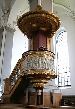 El párroco Jacob Jensen Hvid tomó la iniciativa de dar un nuevo púlpito a la iglesia, recaudó fondos y contactó al arquitecto Caspar Frederik Harsdorff, al escultor Johannes Wiedewelt y al pintor Peder Als para que presentaran un diseño. Este diseño fue aprobado directamente por el rey Cristián VII. No se sabe quién realizó las distintas partes de la obra. El púlpito fue montado en el verano de 1773 en la columna del sureste. Es de madera pintada en forma de mármol con matices amarillos y detalles dorados, con una escalera de balaustres blancos que rodea parcialmente la columna. Un relieve central blanco representa a los doce apóstoles. Este relieve está flanqueado por otros dos relieves que representan a cuatro profetas del Antiguo Testamento, dos a cada lado. Entre los profetas y los apóstoles hay dos placas de texto que juntas forman un versículo de la Biblia (Efesios 2:20):