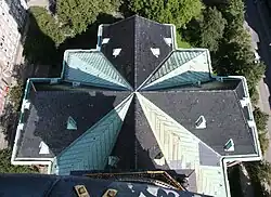 El techo de los cuatro brazos está cubierto de teja vidriada negra. Sobre el tejado hay 25 ventanas de buhardilla, dispuestas en dos niveles. El techo de los edificios anexos a los brazos tiene un recubrimiento de cobre en el techo. La torre de cuatro lados se eleva sobre el brazo oeste del templo y se divide en tres niveles delimitados por cornisas. La torre tiene aberturas de arco de medio punto en sus lados libres, con parteluces y balaustradas de arenisca. El nivel superior de la torre está adornado con pilastras del mismo estilo que el resto del edificio, y en la cornisa superior hay un reloj en cada lado.