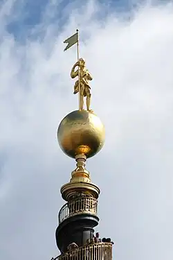 La parte superior de este octógono es un mirador con una barandilla dorada. Desde este mirador empieza la escalera de caracol que en sentido contrario a las manecillas del reloj asciende cuatro veces alrededor de la torre con un total de 150 escalones que son más pequeños a medida que se asciende. La escalera termina en un punto ciego, en una base dorada que sostiene un globo y la escultura de Jacob Høvinghof conocida como Mannen ("el hombre"), una representación de Jesucristo con un estandarte que tiene la particularidad de estar desproporcionada, posiblemente debido a que debe apreciarse desde abajo, a gran distancia. La pared a lo largo de la escalera está decorada con nichos de marcos dorados.