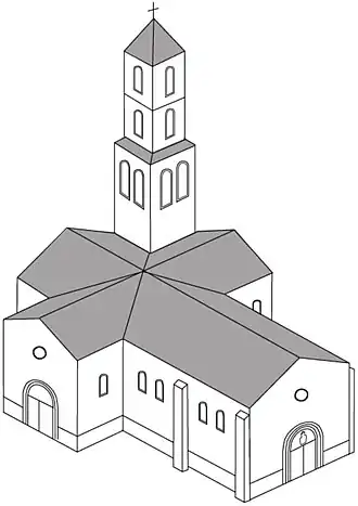 ![]() Recreación hipotética de la iglesia para principios del siglo XIX, basado en un dibujo de De Retz en 1800. | ||