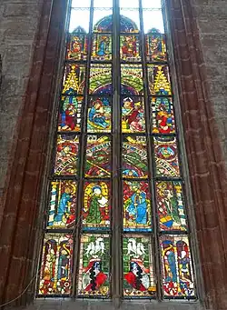 Algunas de las vidrieras del coro, la mayoría de las cuales se han conservado, fueron realizadas alrededor de 1500 por el pintor de vidrios Veit Hirsvogel según los diseños de Durero y Hans Suess von Kulmbach. Esto incluye la ventana del emperador en el centro del presbiterio, donada por el emperador Maximiliano I en 1514, con imágenes del emperador y su esposa María von Borgoña, quien murió en 1482, el hijo mayor, Felipe el Hermoso y su esposa Juana la Loca de España, que murió en 1506, y los santos patronos de la Casa de los Habsburgo (Santiago, Andreas, Leopoldo y Jorge), así como 16 escudos de armas que representan a los países de la Casa de los Habsburgo en toda Europa. La ventana imperial está flanqueada a la izquierda por la ventana del obispo de Bamberg, en cuya diócesis se encuentra la ciudad, y a la derecha por la ventana de la Casa de Hohenzollern, de donde procedían los burgraves medievales de Núremberg y más tarde los príncipes. de los vecinos margraviates de Ansbach y Kulmbach-Bayreuth ("ventanas de margrave"). Estas tres ventanas "forman el andamiaje político sobre el que cae la mirada de todos los feligreses en línea recta", representan el gobierno y el orden en el Sacro Imperio Romano Germánico con referencia a la ciudad imperial de Núremberg.[4] La donación de ventanas individuales se reservó para los patricios gobernantes de Núremberg, cuya iglesia de matrimonio y entierro más distinguida fue la Sebaldskirche. El derecho a montar una ventana siempre lo concedía el ayuntamiento. Algunas familias donaron cristales individuales, otros, ventanas enteras. En ellos se pueden ver los escudos de armas de las familias donantes y sus parientes cercanos, a menudo también representaciones figurativas de los donantes así como escenas bíblicas y santos. En el coro norte, a la izquierda de la ventana de Bamberg, está la ventana de los Stromer, a su izquierda la de los Fürer (de 1501, parte más antigua de 1379, originalmente una ventana comunitaria de las familias Eisvogel, Pfinzing, Langmann y Ebner ), en el coro sur está a la derecha de la ventana del Margrave, la ventana de Pfinzing, seguida de la ventana de Haller (otra de esta familia se encuentra en la nave norte), la ventana de Schürstab y la ventana de Behaim (monumental árbol genealógico de la familia también se puede encontrar en la pared sur). Esta última es una de las mejores y mejores ventanas de la época del primer vidriado del presbiterio a fines del siglo XIV. Siglo. En el lado sur sigue la ventana Volckamer a la derecha, luego la ventana Imhoff y, en la transición del presbiterio a la nave, la ventana de las familias relacionadas Grabner, Paumgärtner y Pirckheimer. La pequeña ventana de Pömer en la bahía del segundo pasillo (desde el oeste) también es digna de mención en la nave sur; está cerca del lugar de enterramiento de Pömer y del epitafio de Pömer en el exterior de la iglesia. En el lado norte del pasillo, en la primera bahía (la más occidental), está la ventana de Muffle, que también contiene escudos fragmentarios de ventanas más antiguas; tres tramos más allá de la ventana Holzschuher y al comienzo del coro del salón norte, sobre la capilla Pfinzing, la ventana de la familia Grundherr, que Michael I. Grundherr († 1388) donó en memoria de sus padres Heinrich I. Grundherr y Kunigunde Gletzelmann.